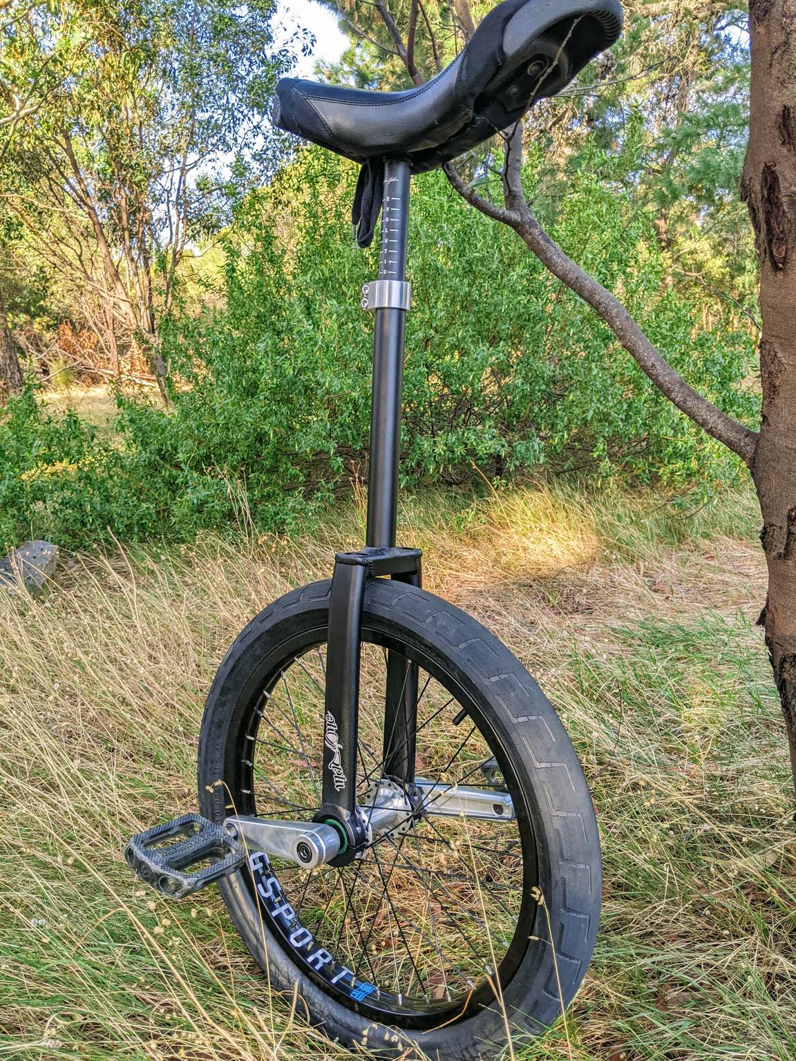 Just showing off the new une! Started as an old KH 19" and I've gradually swapped out everything but the seat, hub and pedals.