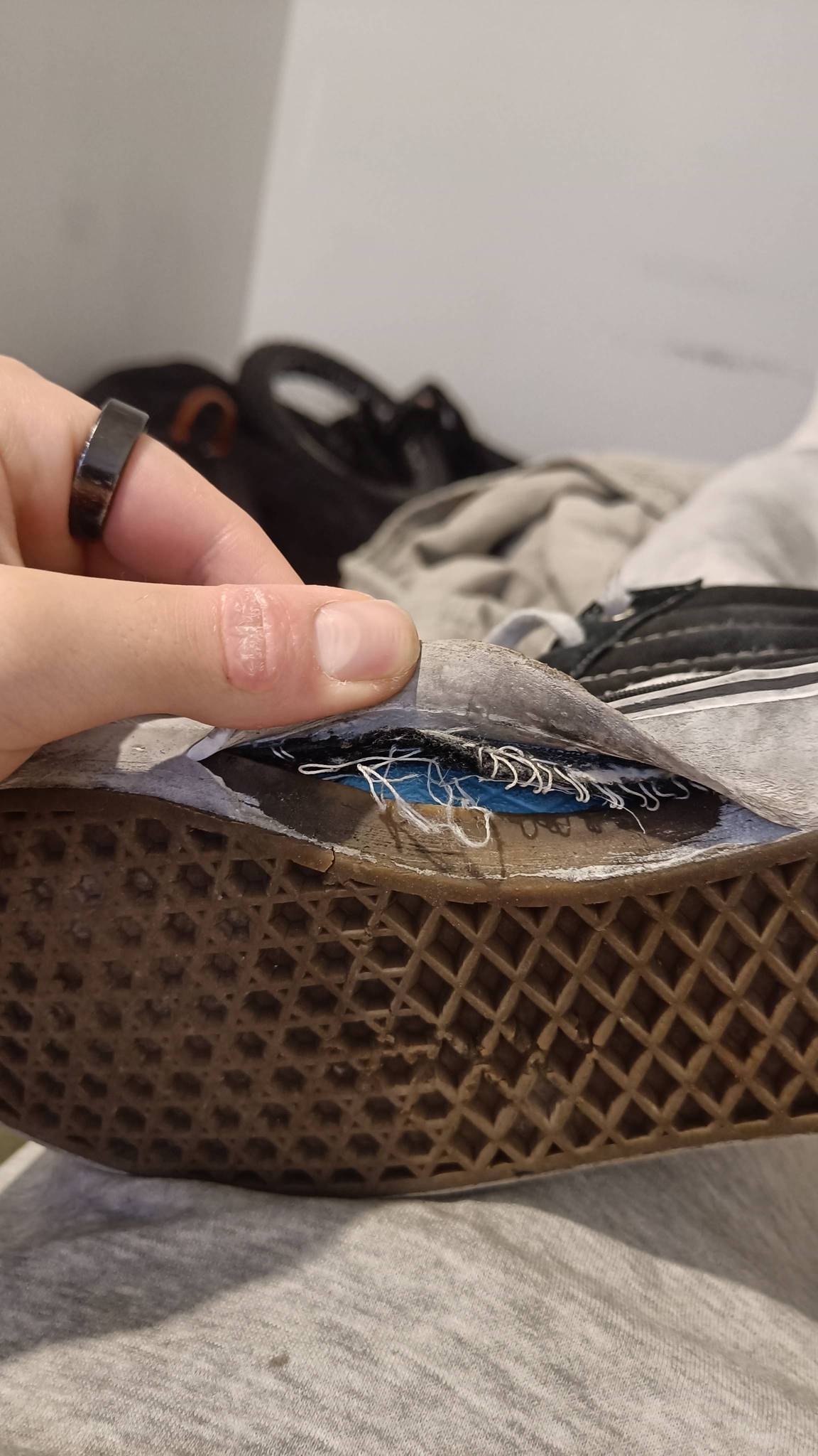 I was practicing sidespins and somehow my crank ripped the bottom of my shoe. Does this kind of thing happen often? Should i just try to tape or glue my shoe back together?